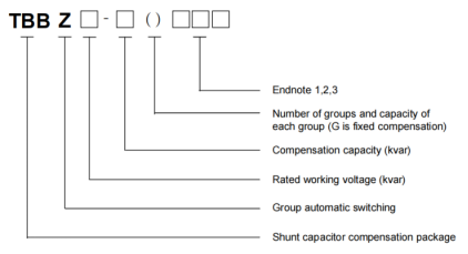 For example: TBBZ10-1500(600 + 900) -AK indicates voltage of 10kV, device capacity of 1500kvar, two groups, 600kvar, 900kvar, single star wiring, and open triangle voltage protection.